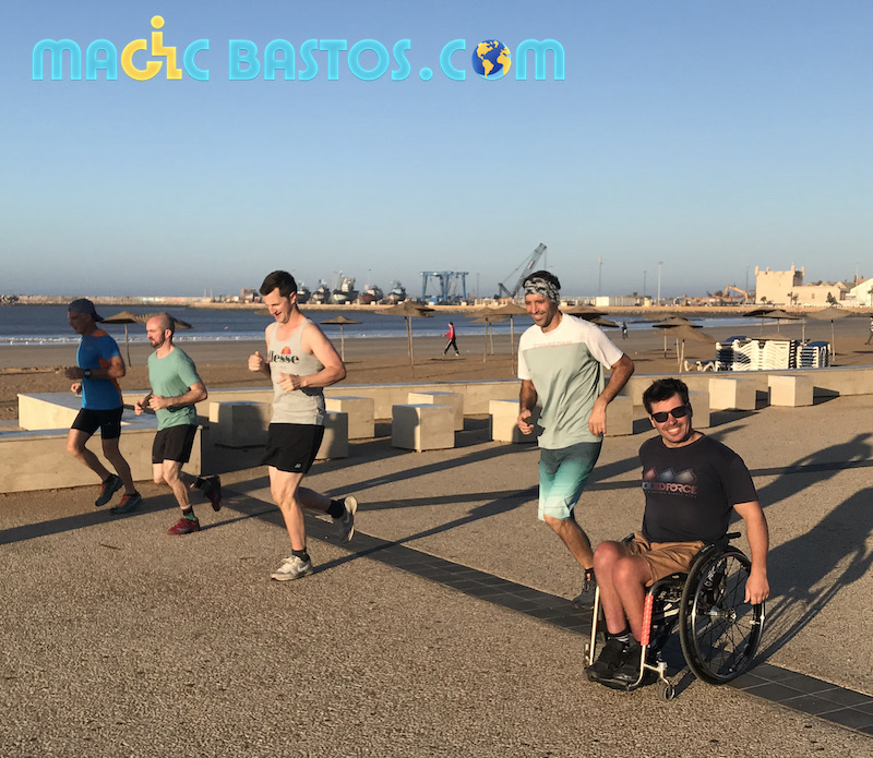 et profitent de belles balades ou footings le long de la grande plage d’Essaouira, parfaitement adaptée aux déplacements en fauteuil roulant.