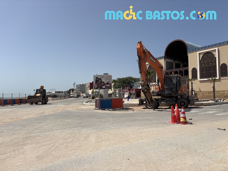 En 2025, toute la ville de Dakhla est en travaux pour la rénovation du réseau d’assainissement. Les rues sont coupées par des tranchées, les trottoirs très hauts et souvent défoncés.