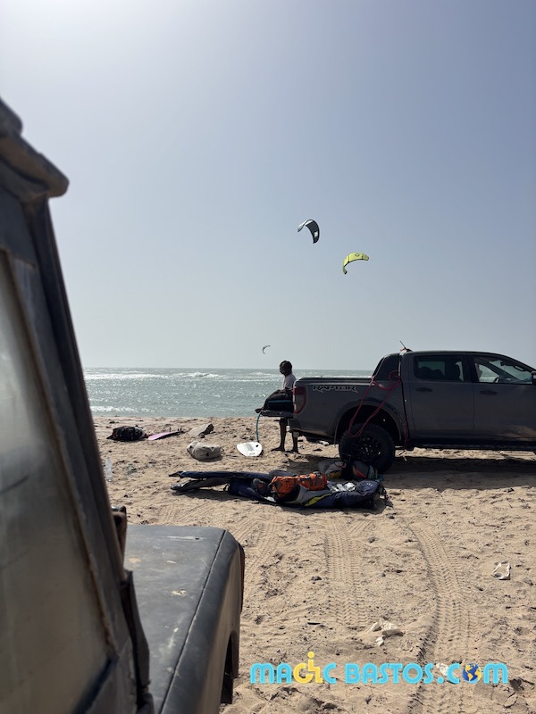 Dakhla est mondialement connue comme spot de kitesurf. Bastos n’avait pas pris son matériel, mais Amélie et lui ont pu assister à la Coupe du Monde de kitesurf dans les vagues — un spectacle impressionnant qui a redonné à Bastos l’envie de s’y remettre.