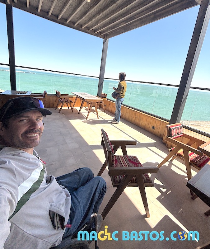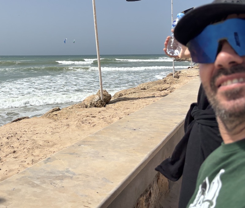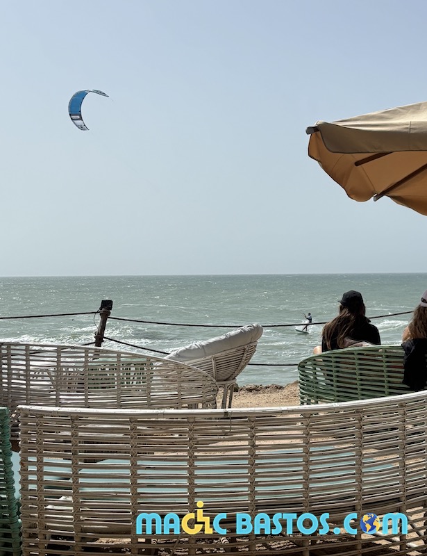 Dakhla est mondialement connue comme spot de kitesurf. Bastos n’avait pas pris son matériel, mais Amélie et lui ont pu assister à la Coupe du Monde de kitesurf dans les vagues — un spectacle impressionnant qui a redonné à Bastos l’envie de s’y remettre.