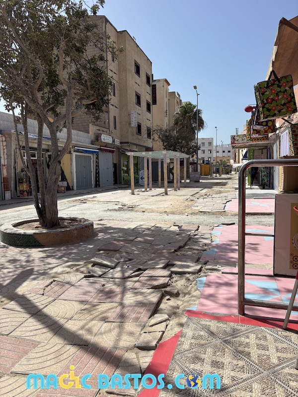 En 2025, toute la ville de Dakhla est en travaux pour la rénovation du réseau d’assainissement. Les rues sont coupées par des tranchées, les trottoirs très hauts et souvent défoncés.