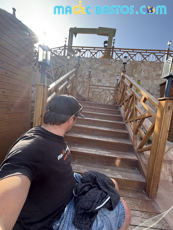 Surprise à l’arrivée : trois grandes marches barrent l’entrée du bâtiment. Heureusement, les deux réceptionnistes, très sympathiques et toujours présents, ont aidé Bastos à franchir ces marches à chaque sortie et retour.