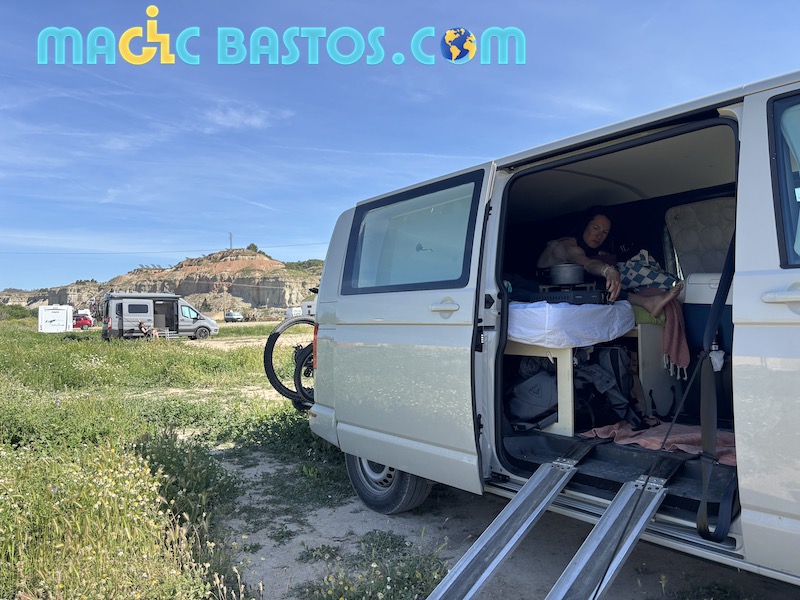 avant de se faire sortir par les gardes. Il n’est pas possible de dormir sur le site la nuit. Ils roulent jusqu’au parking camping-car qui se trouve à Arguedas à l’entrée du parc.
