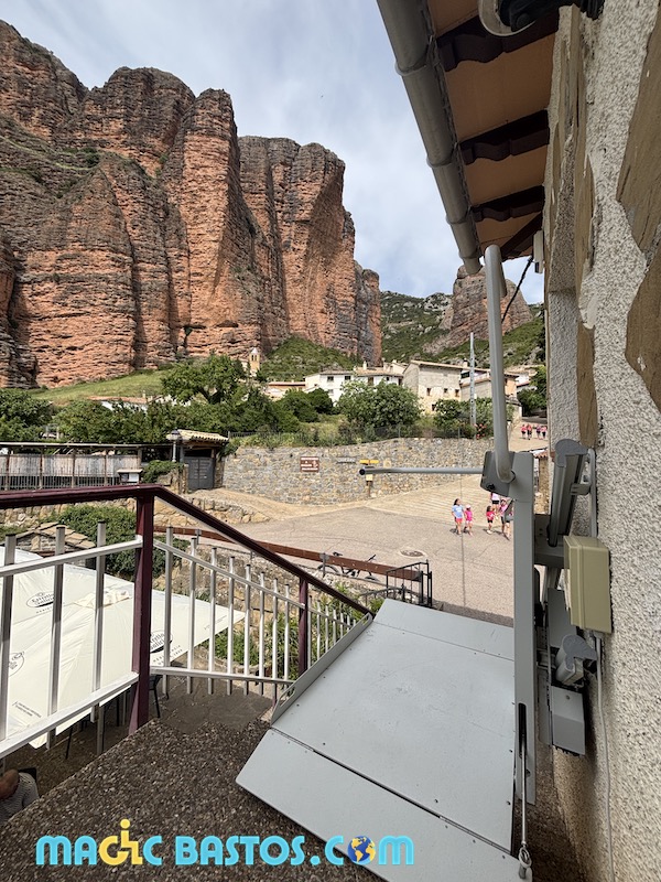 avant de déjeuner au restaurant Mallos de Riglos, équipé d’un monte-escalier permettant l’accès à la terrasse.