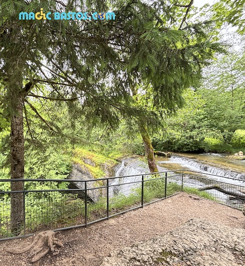 Bastos et Amélie commencent par la cascade du Saut de la Forge. Du parking, ils descendent sur un chemin de terre sur 100m pour arriver à un premier point de vue sur le haut de la cascade.