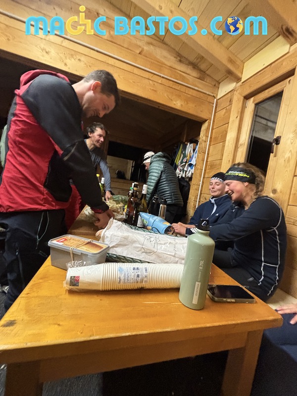 Après 1h15 de montée, ils partagent un casse-croûte dans la cabane de l’ESF au sommet, avant de redescendre en seulement dix minutes à la frontale en prenant soin de passer sur les pistes pas encore damées pour ne pas endommager le travail des dameurs (Le chef du dommage est passé nous signaler de bien faire attention)