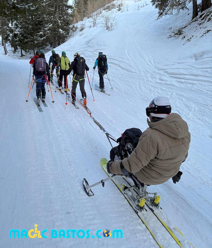 Bastos, en fauteuil-ski, est tracté par un groupe de skieurs de randonnée. Agnès, Sandrine, Oriane, Marine, John, Lou, Fab, Eliot et Gilles se relaient pour l’accompagner jusqu’au plateau de Plan Bois, à 1 880 m, après la fermeture des remontées mécaniques.