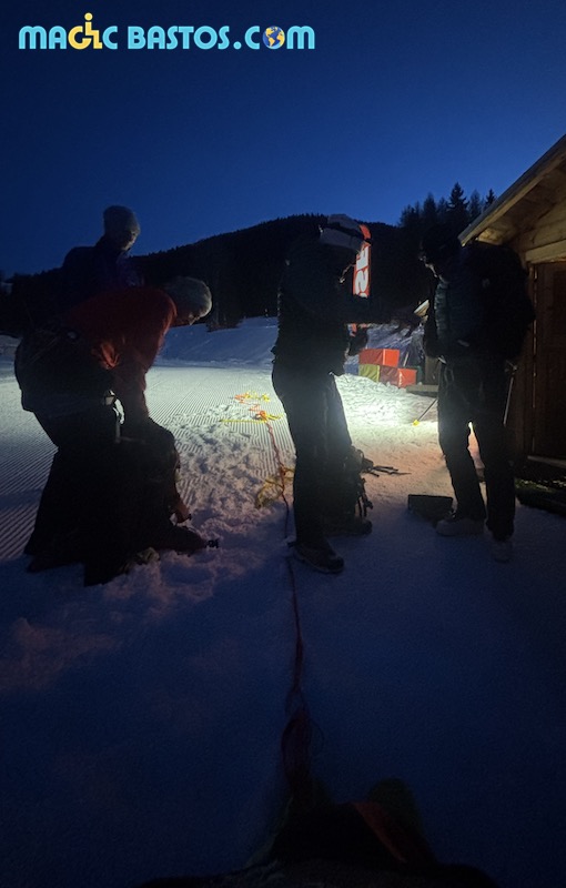 Marie, Marine, John, Lou, Didier, Gilles, Éric… se relaient pour tracter Bastos en fauteuil-ski jusqu’au plateau de Plan Bois, sur le secteur de Montchavin à La Plagne. Le départ a lieu depuis Les Coches à la fermeture des remontées mécaniques vers 18h30 ; en ce début d’année, la nuit tombe juste quand nous partons