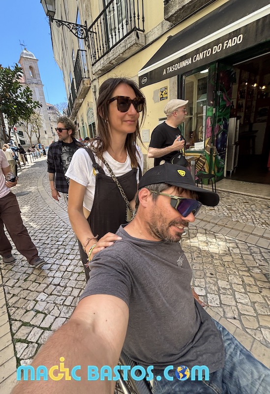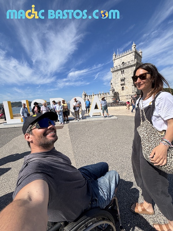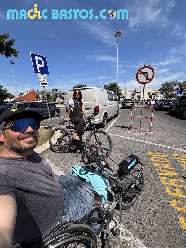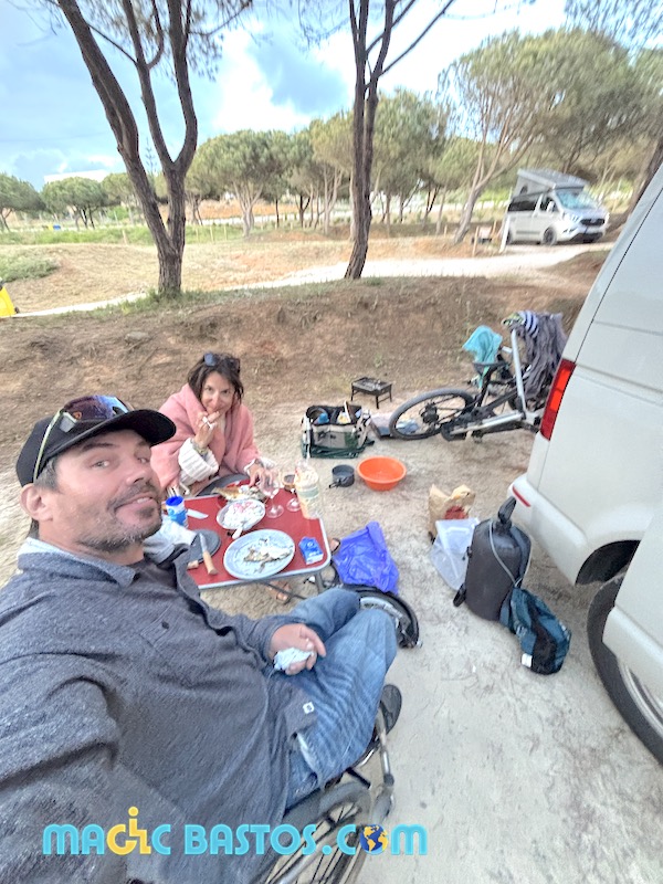 Amélie et Bastos passent une nuit (un peu bruyante) au camping près de Lisbonne avant de consacrer la journée suivante à la visite de la ville. Le camping dispose de sanitaires accessibles en fauteuil roulant, ce qui leur permet de s’y installer confortablement malgré l’agitation nocturne.