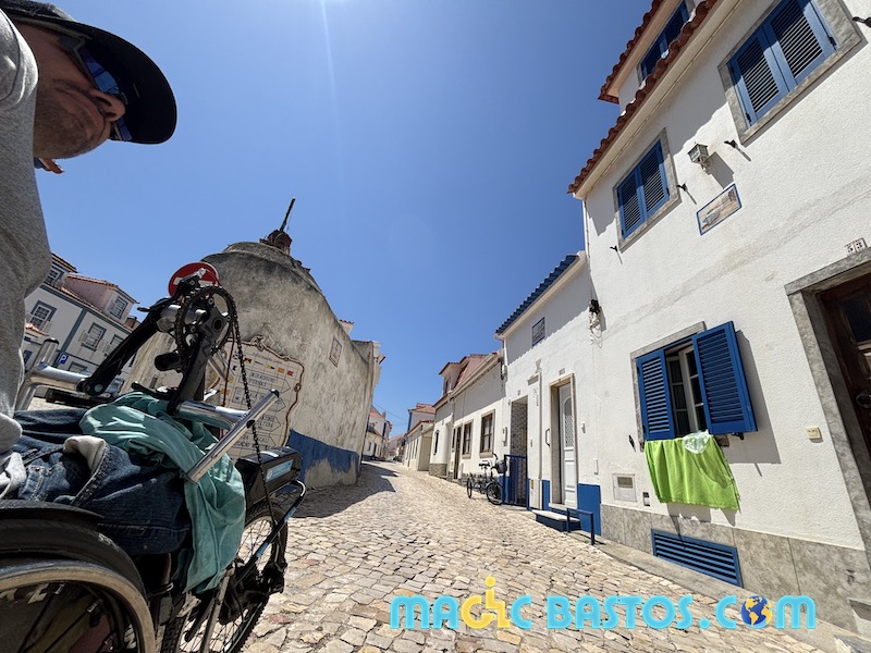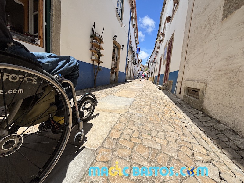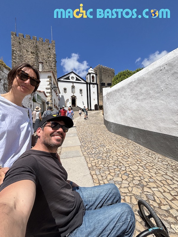 Entre Nazaré et Peniche, Amélie et Bastos s’arrêtent à Óbidos, un joli village fortifié. À l’entrée du village, il y a un grand parking payant ainsi qu’un petit parking derrière l’office du tourisme, avec des places et des toilettes accessibles aux personnes handicapées.