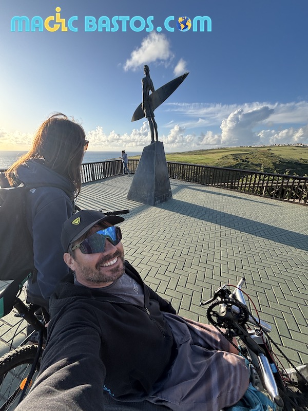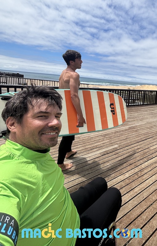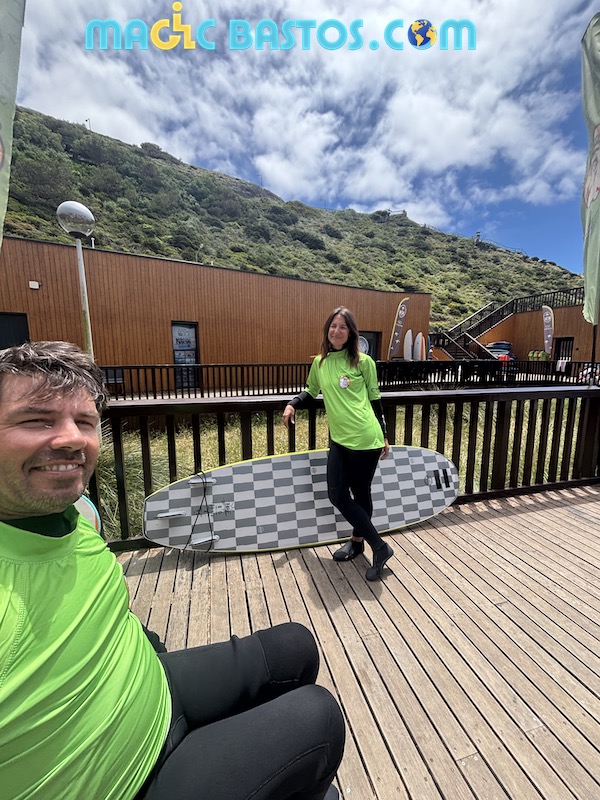 Ils font aussi une session surf. Ils prennent un cours avec l’école Surf With Pepe sur la plage de Ribeiro de l’Ilhas. Ils sont 2 moniteurs pour aider Bastos à rejoindre l’océan et le stabiliser dans les vagues.