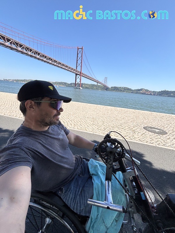 Durant le séjour ils se déplacent uniquement en vélo. Bastos utilise sont handbike à clamper qui se fixe sur sont fauteuil roulant.