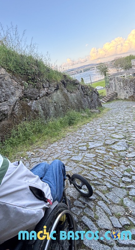 Bastos est équipé de sa 3ème roue Freewheel et de son handbike à clamper pour rouler plus facilement sur les pavés. Amélie intervient pour monter les pentes trop raides.