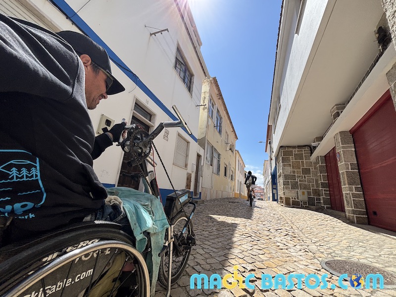 Bastos est équipé de sa 3ème roue Freewheel et de son handbike à clamper pour rouler plus facilement sur les pavés. Amélie intervient pour monter les pentes trop raides.