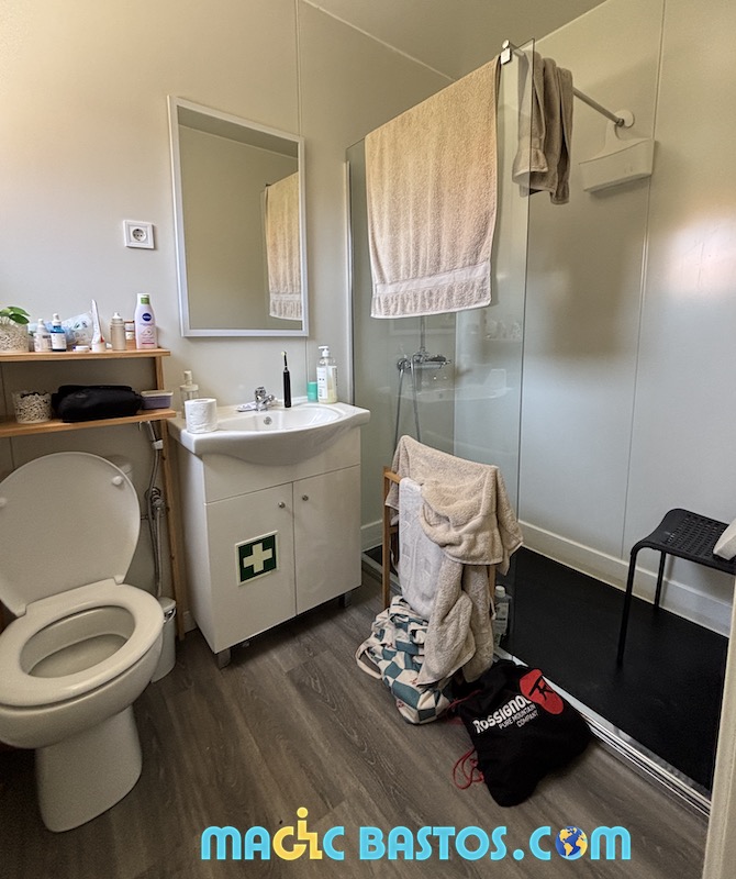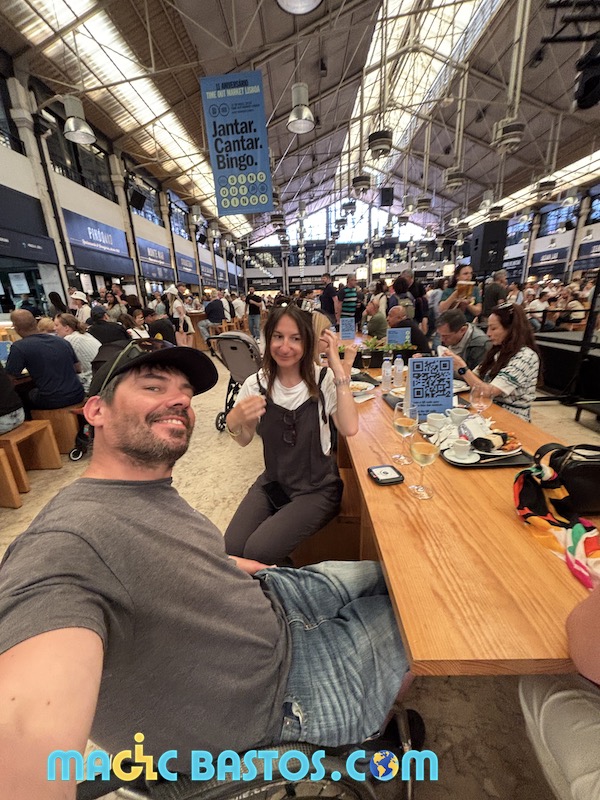 Amélie et Bastos passent une nuit (un peu bruyante) au camping près de Lisbonne avant de consacrer la journée suivante à la visite de la ville. Le camping dispose de sanitaires accessibles en fauteuil roulant, ce qui leur permet de s’y installer confortablement malgré l’agitation nocturne.