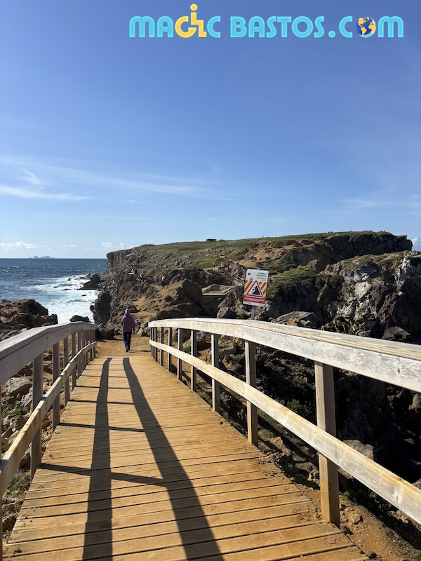 Celle-ci est bien aménagée, avec un chemin en bois qui permet à Bastos de franchir la dune de sable. Devant eux, les vagues déferlent et quelques surfeurs s’élancent sur l’eau, offrant un beau spectacle.