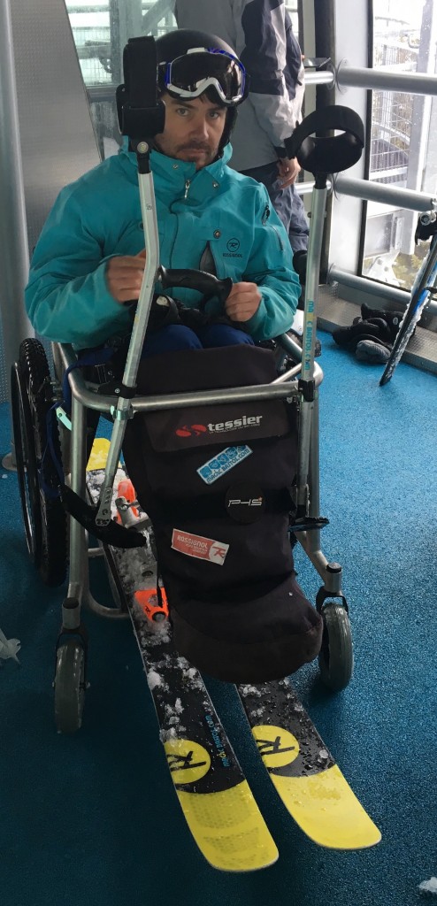 Le Snowheel est une plateforme roulante qui permet aux handiskieurs utilisant un appareil de ski assis en solo de pouvoir utiliser les télécabines de façon autonome sans avoir à sortir de sa coque.