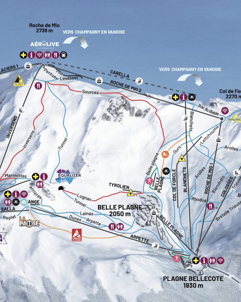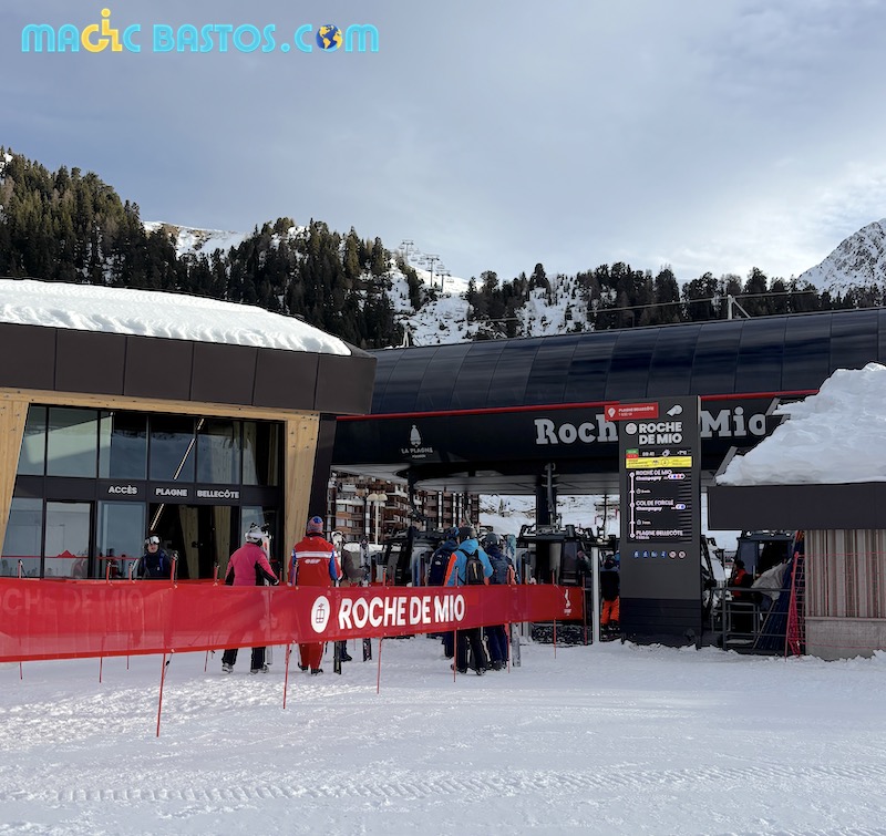 La nouvelle télécabine de la société française POMA relie le Front de Neige de Plagne Bellecôte (1 930 m) au sommet de Roche de Mio (2 740 m), avec une gare intermédiaire au Col de Forcle (2 270 m).